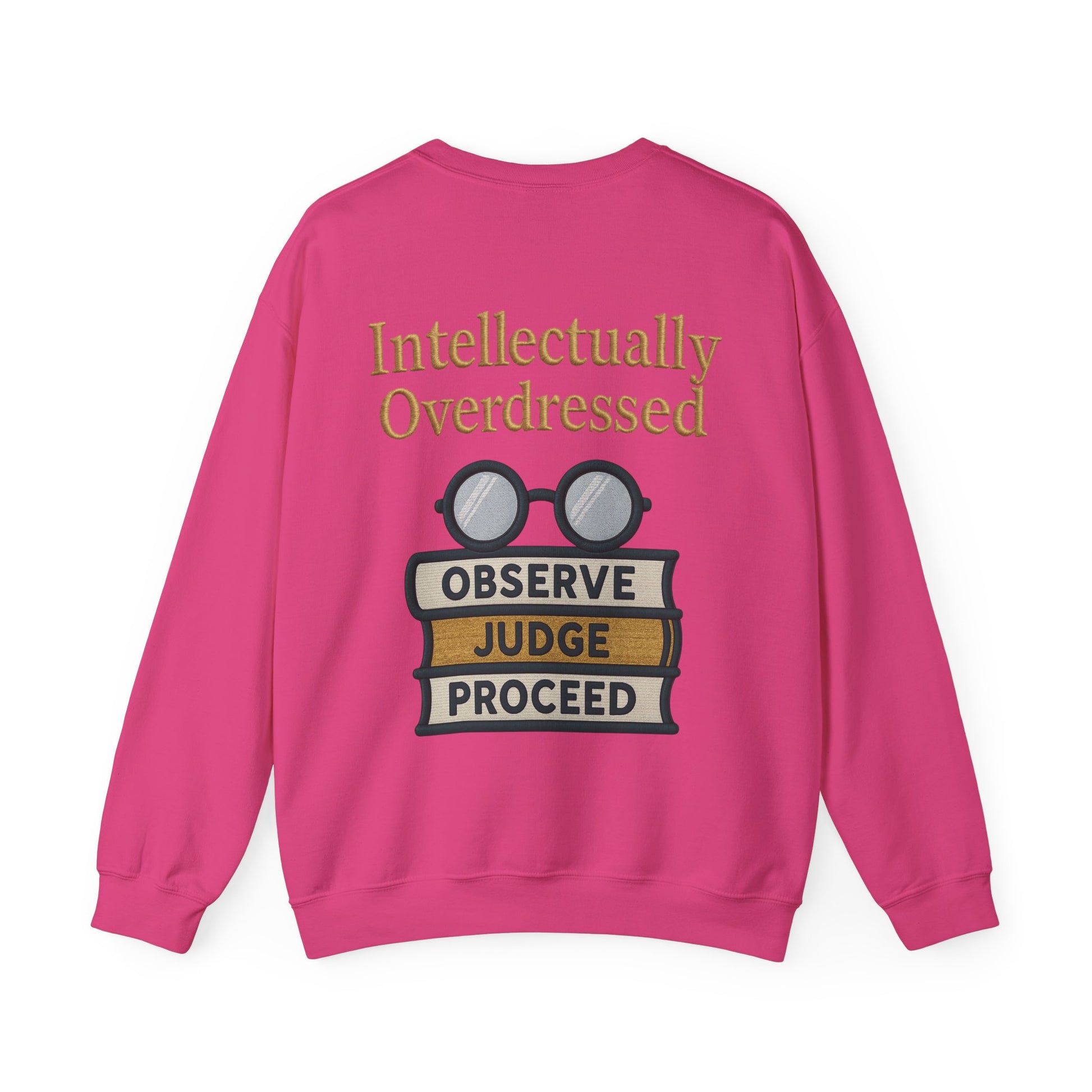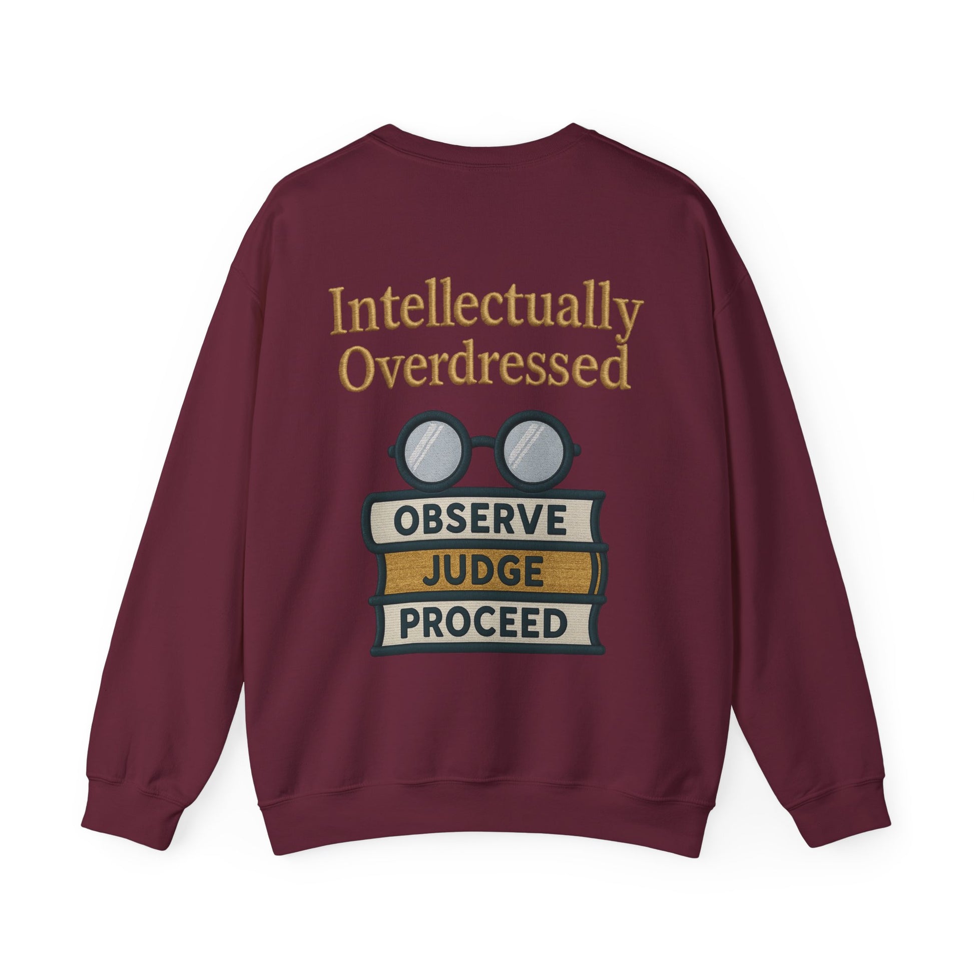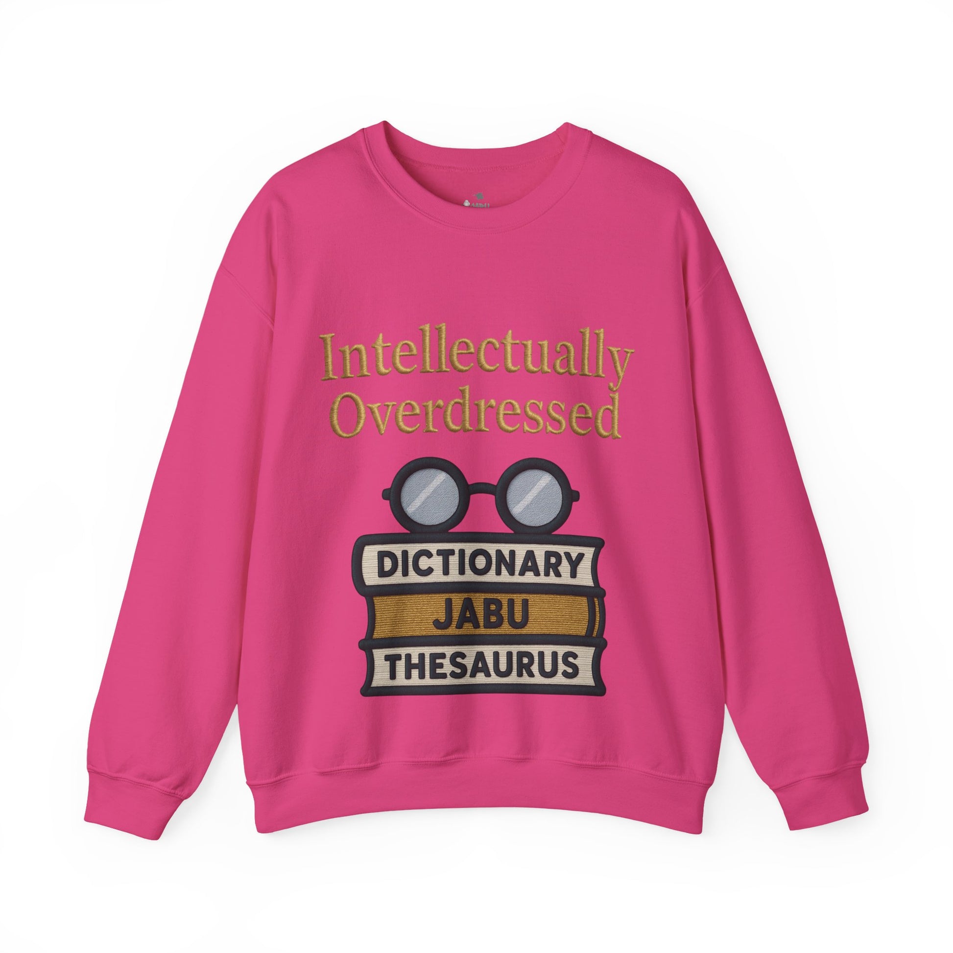 This cozy crewneck blends quiet wit with everyday wearability. Soft, medium-weight fabric holds a bold, bookish print: stacked reference books topped with vintage round spectacles and the words “Intellectually Overdressed.” It reads like a wink to lovers of language and dry humor—an easy layer for campus walks, study sessions, or coffee-shop strategizing. The fit is relaxed and classically cut, so the design takes center stage without shouting. Wear it when you want to look thoughtful, a little playful, and comfortably put together.